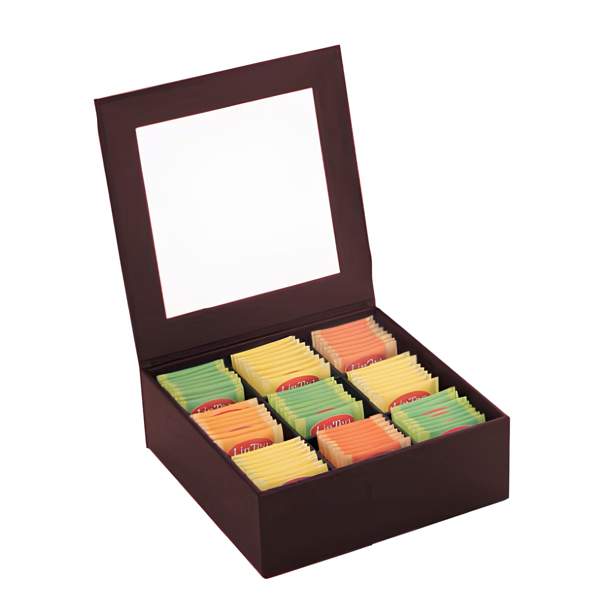 CAIXA CHÁ MDF/COURO SINTÉTICO 9 COMPARTIMENTOS 24X24CM H8,5CM MARROM -MIX-